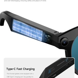 A: The glasses support Bluetooth calling, music playback, and dual control via touch sensors and a companion mobile app, with Type-C for charging.