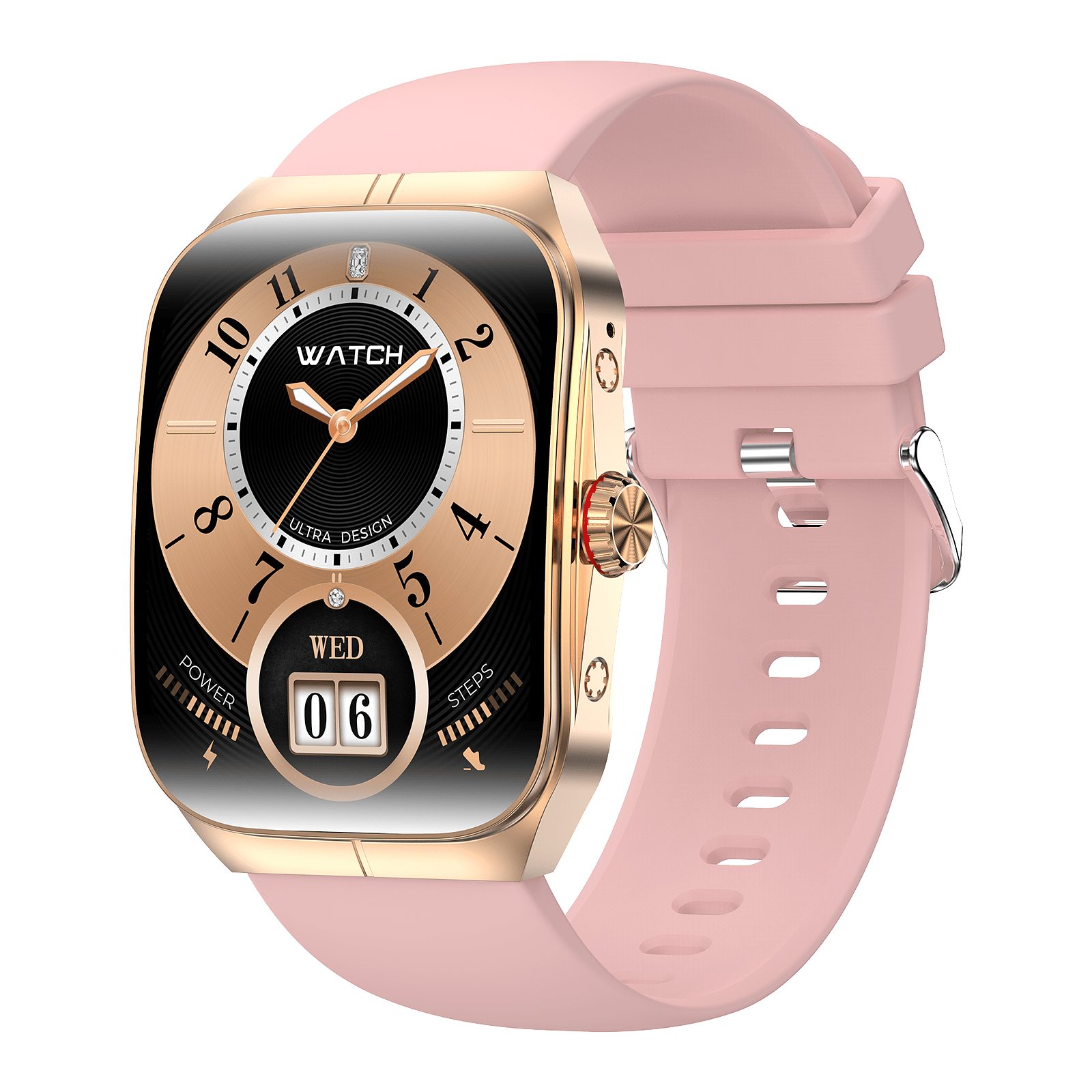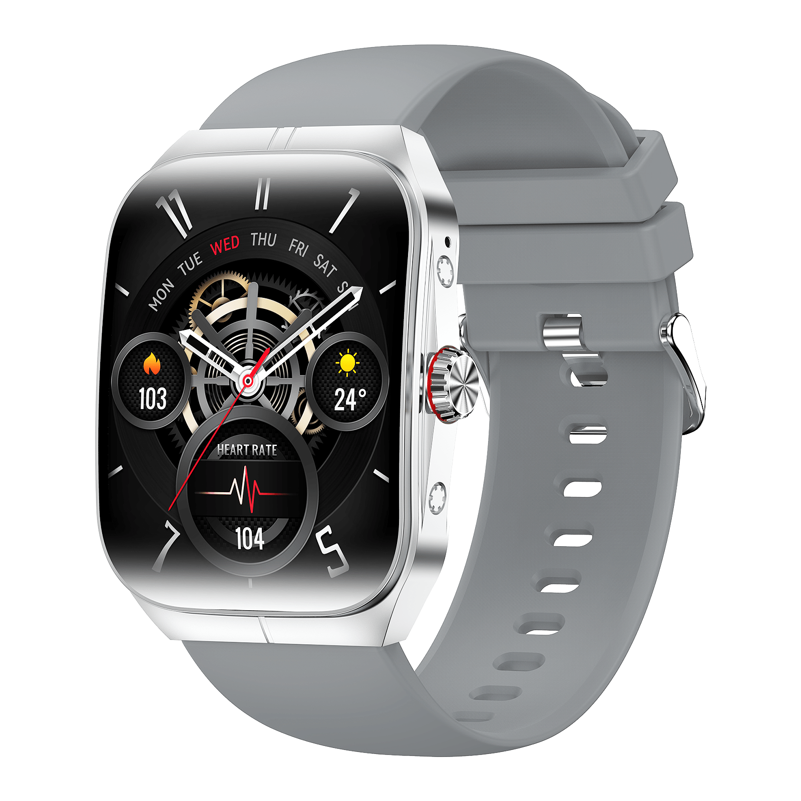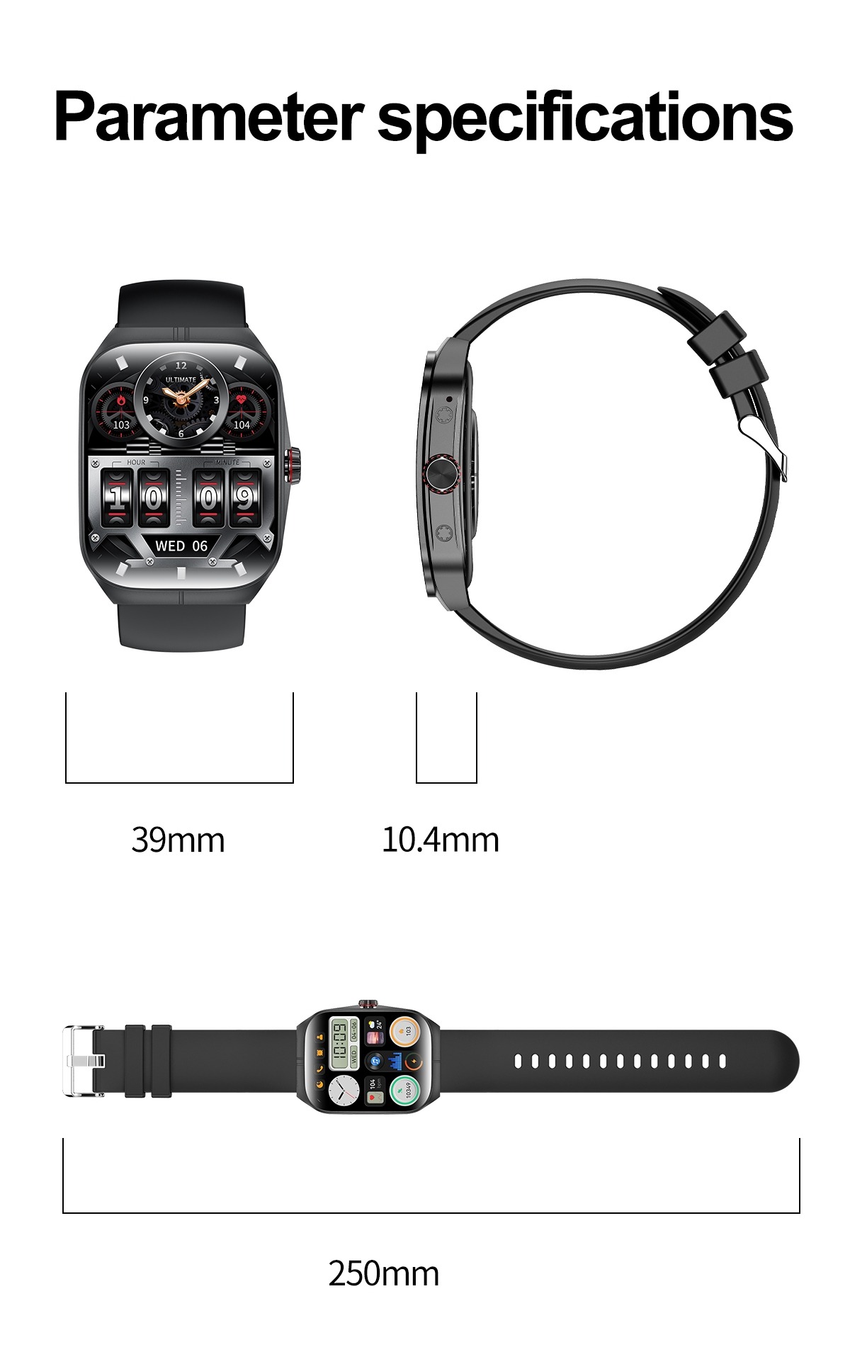 • AMOLED display (410×502 resolution), 44–49mm square alloy case with silica gel band, IP68 waterproof rating