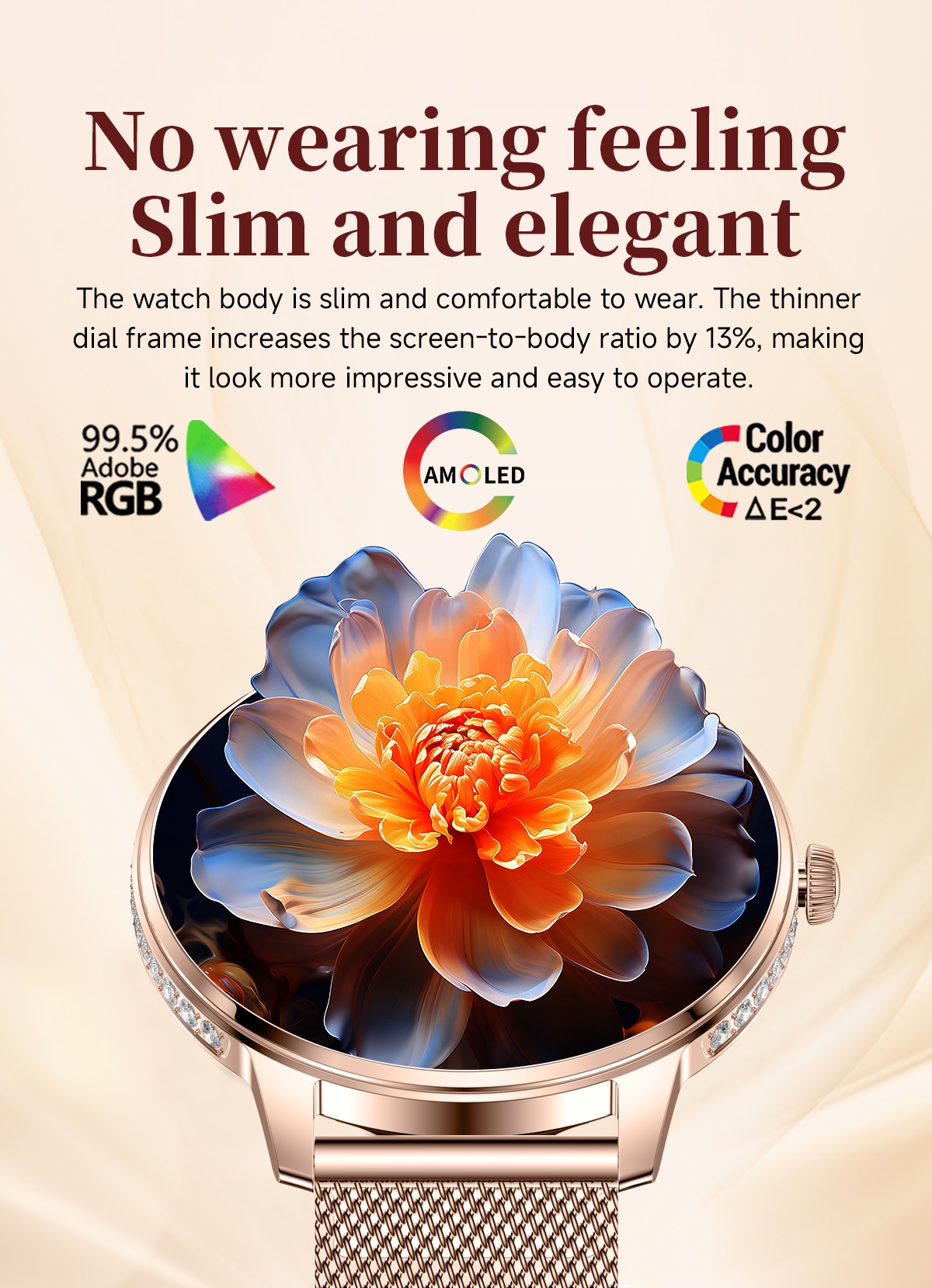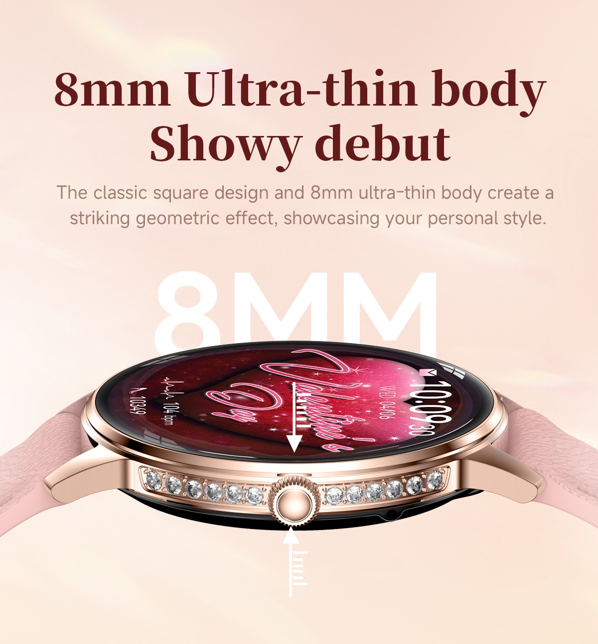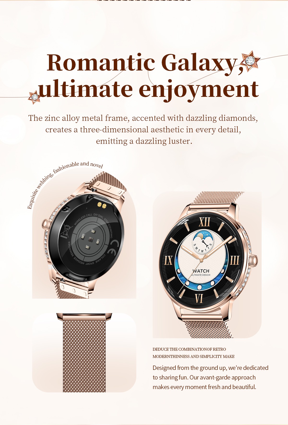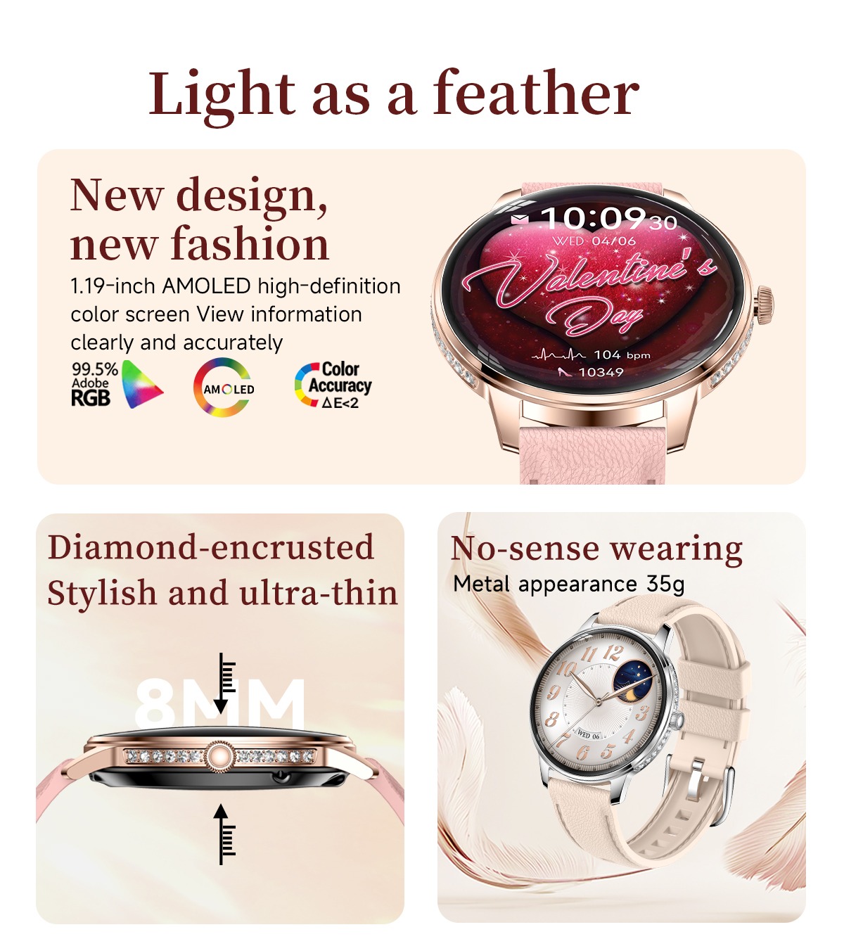 This smartwatch is ideal for women’s fashion electronics retailers, fitness-focused e-commerce platforms, health & wellness boutiques, and telecom accessory distributors. It also suits corporate gifting programs and private-label health tech brands targeting female demographics aged 18–45 seeking style-integrated functionality.