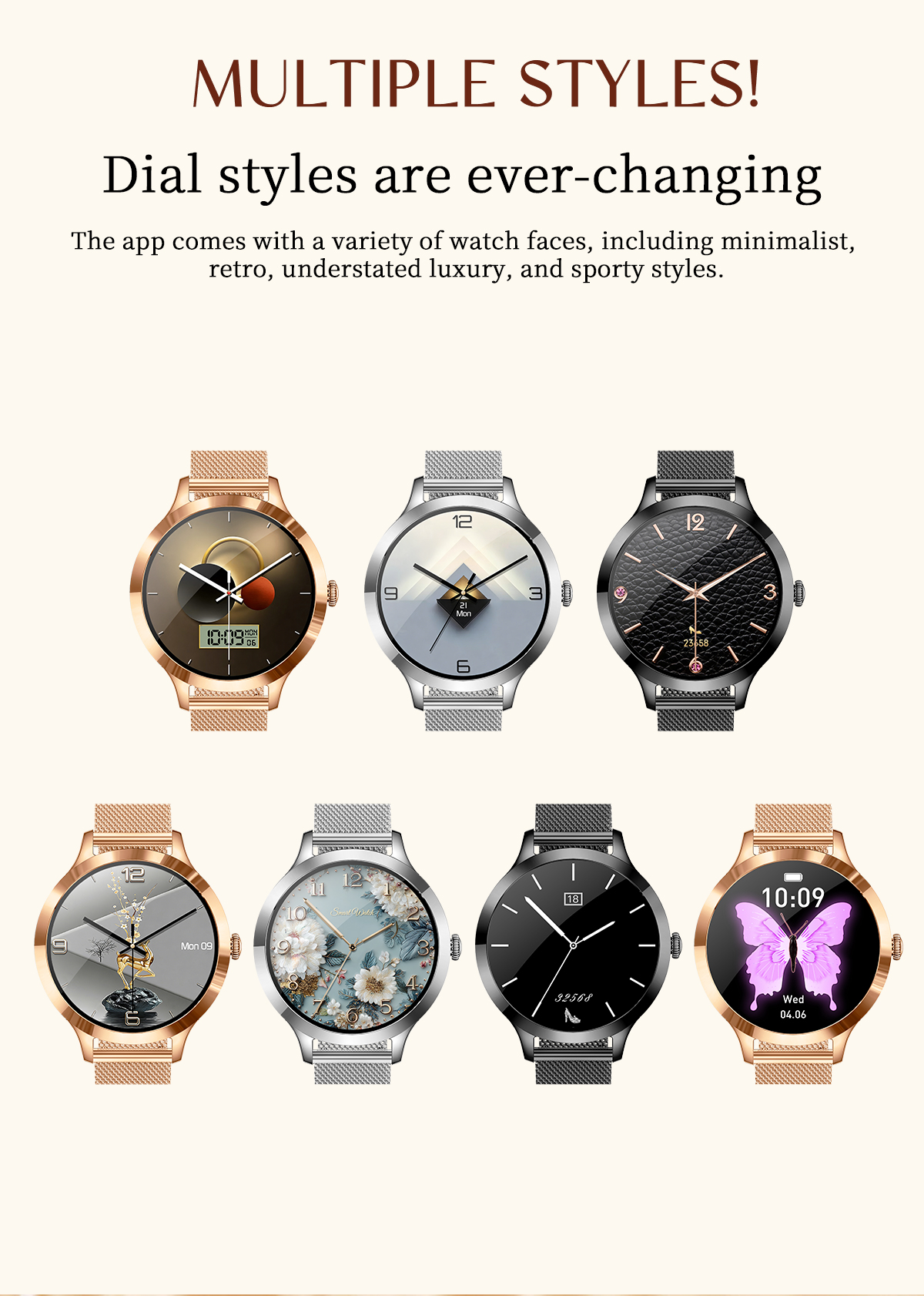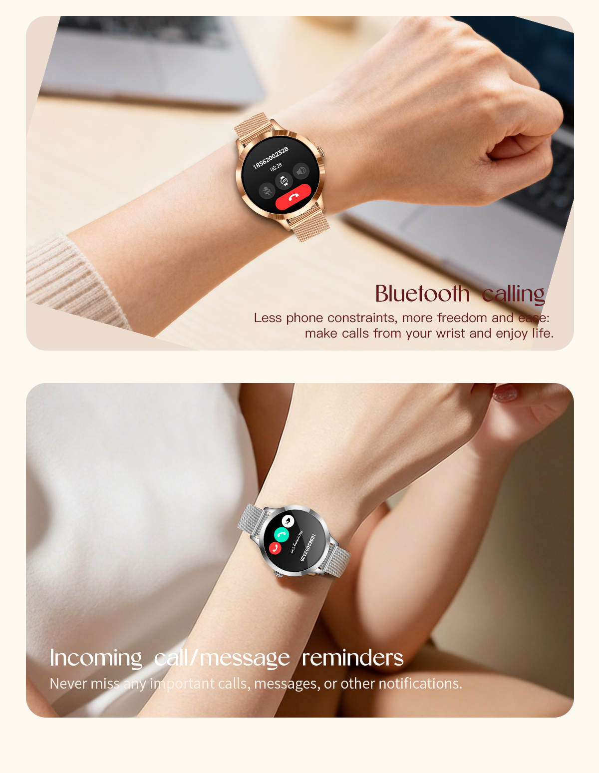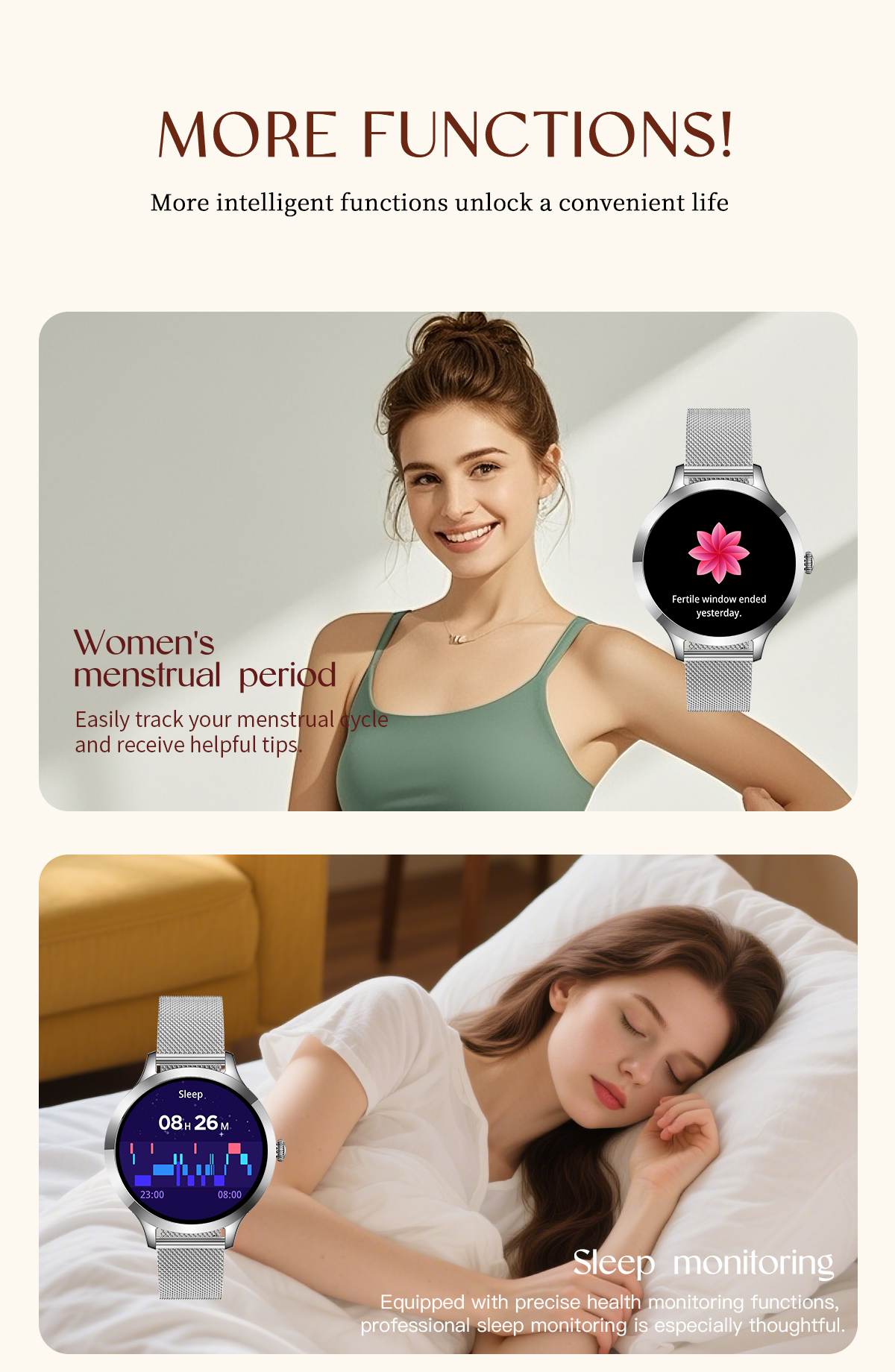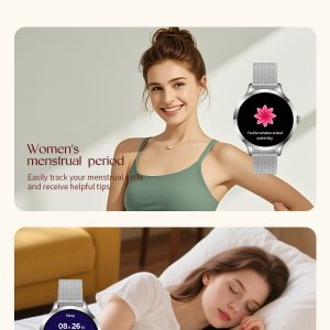 This smartwatch is well-suited for women’s fashion accessories retailers, minimalist lifestyle brands, boutique fitness studios, corporate wellness program suppliers, and e-commerce marketplaces specializing in compact wearables. Its blend of ultra-slim luxury design and core health tracking features also appeals to gift retailers targeting female demographics, as well as subscription box services focused on stylish self-care and wellness products.