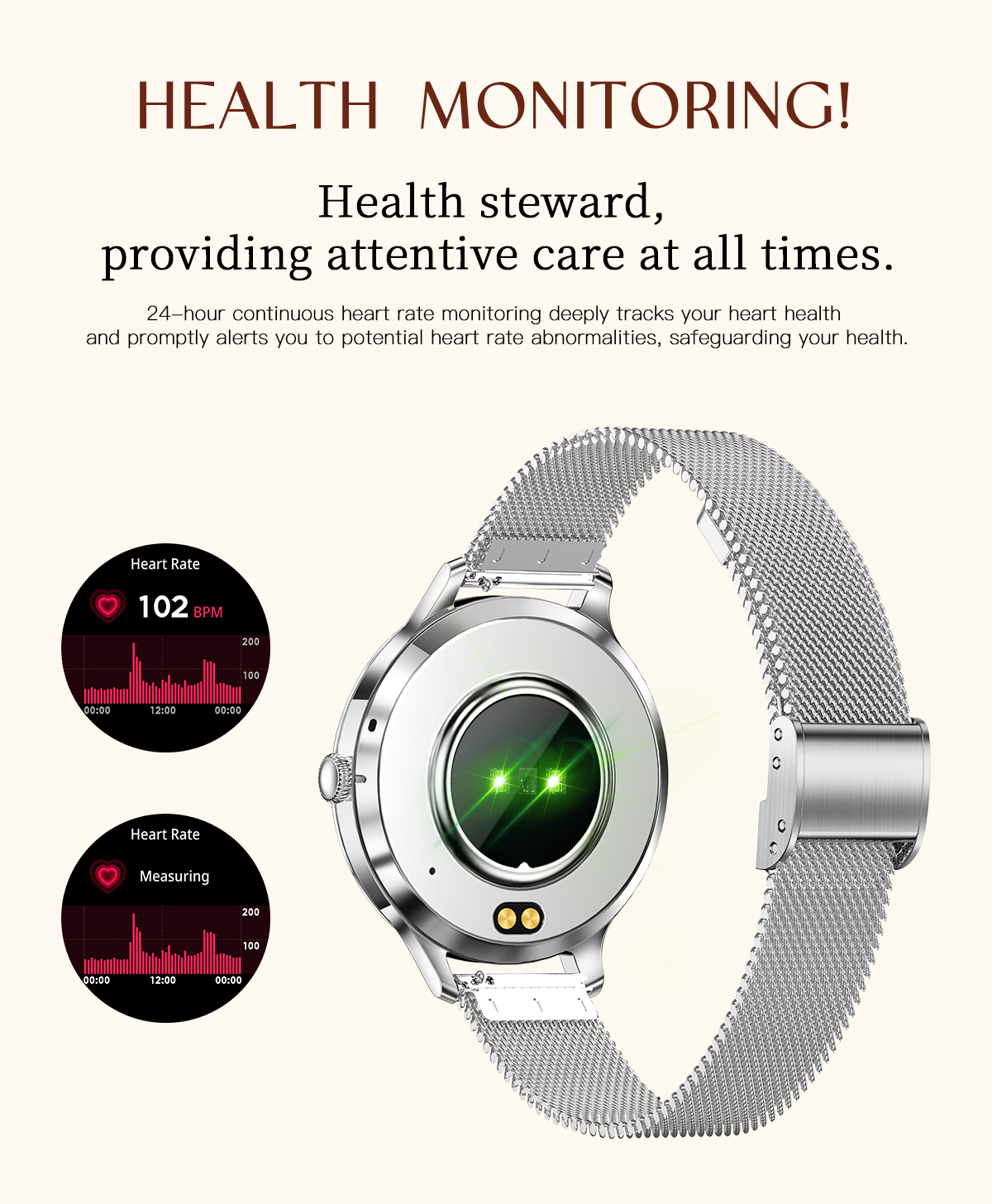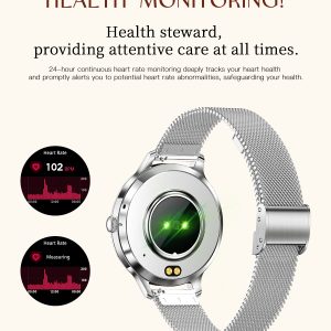 The Women’s Ultra-Thin AMOLED Smart Watch delivers sleek minimalist aesthetics and targeted health monitoring functionality for modern female consumers. Featuring a vibrant 1.04-inch sunlight-readable AMOLED touchscreen, ultra-slim 35mm compact body, IP68-rated durability, and advanced biometric tracking—including real-time heart rate and blood oxygen monitoring—this lightweight wearable integrates seamlessly into daily commutes, workouts, and formal occasions, keeping users connected and healthy without compromising on style.